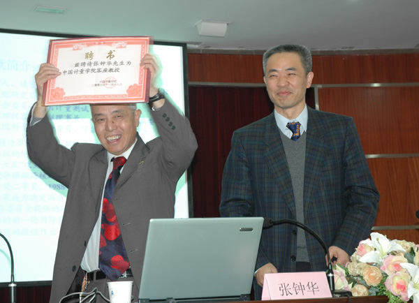 11月23日下午,我校在明德樓B6樓會議室舉行聘任儀式,聘請中國工程院院士張鐘華為我校客座教授。副校長呂進出席聘任儀式,儀式由計量技術工程學院院長李東升主持。   張鐘華院士擅長精密電磁測量、電磁計量基、標準的研究。現任中國工程院信息工程學部常委,中國科學技術協會全國委員會委員,中國計量測試學會常務理事,中國儀器儀表學會電磁測量信息處理儀器學會副理事長,《計量學報》編委會主任委員,中國計量研究院電磁處自然基準室主任、院科學委員會委員、院學會委員會副主任。   儀式上,呂進首先宣讀了學校聘任文件,并向張鐘華院士頒發了聘書。呂進指出,張鐘華院士是我國計量領域杰出的專家,學校很榮幸聘請張院士擔任客座教授,希望張院士今后能對我校的相關學科多加指導,提出寶貴的意見和建議。   張鐘華院士在儀式上發表講話。他說,很高興有機會來到中國計量學院美麗的校園,并擔任學校的客座教授,這對于他來說是一件非常有意義的事情。他希望今后能有機會經常來學校切磋學術問題,和學校師生共同努力攻克國際計量尖端項目,為中國人爭光。   聘任儀式結束后,張鐘華院士為我校05級研究生,03、04級相關專業研究生作了題為《現代計量測試技術進展》的學術報告。
