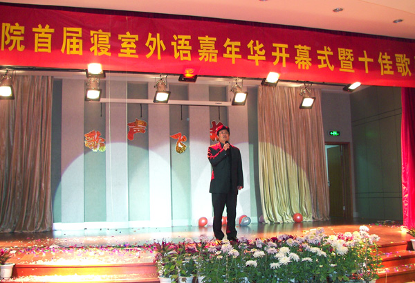 11月23日晚,外國語學院首屆寢室外語嘉年華開幕式暨十佳歌手總決賽在方圓樓南5樓舉行。校黨委副書記徐涌金應邀出席了會議。相關職能部門負責人、部分二級學院分團委書記以及外國語學院黨政領導參加了開幕式。機電學院韓玲莉副教授,圖書館開紅老師,后勤服務公司張巧云老師,外國語學院連紅、王欣老師以及江淼同學擔任了比賽的評委。   比賽在活力四射的穗子舞表演中拉開帷幕。來自各年級的十三位選手登臺亮相,為觀眾呈上一出精彩的表演。穿插在比賽中的寢室英語音樂劇《梁祝新傳》、張巨航同學表演的魔術以及外教表演的歌曲和瑜珈給整場賽事增添了一筆亮色,贏得了在場觀眾的陣陣掌聲。最終,參加過四屆十佳歌手比賽的,大四學生楊宇飛憑著嫻熟的唱功,以一曲《把你寵壞》征服了現場評委和觀眾,摘取桂冠。   校黨委徐涌金副書記充分肯定了這次活動,他指出,外國語學院寢室外語嘉年華活動,無論是主題還是形式都充滿了創意和智慧。活動把寢室和外語學習緊密聯系在一起,創造了良好的寢室外語學習的氛圍,希望外國學院今后在全校普及寢室外語過程中起到更大的帶頭作用和推動作用。   “一曲成名,十佳大展歌喉”為外國語學院寢室外語嘉年華活動起了一個良好的開端。接下來,外國語學院還將有“雙雄爭霸,辯論唇槍舌戰”寢室英語辯論賽;“三人成聲,晨讀書誦朗朗”瘋狂英語晨讀會;“四面采風,外語學習之旅”英語志愿者實踐一幫一結對子、英語角;“五色流年,座談寢室英語”寢室英語座談會;“六思合韻,設計溫馨家園”寢室風采設計大賽等為期一個月的系列活動,12月24日晚上的“七彩紛呈,圣誕共聚一堂”圣誕晚會將為整個活動畫上圓滿的句號。