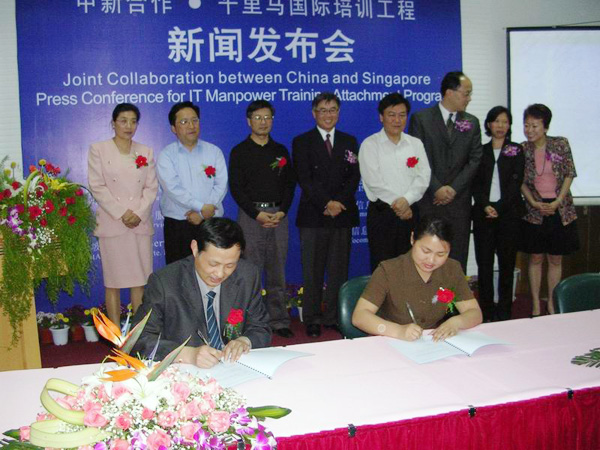 4月21日下午,“中新合作·千里馬國(guó)際培訓(xùn)工程”新聞發(fā)布會(huì)暨簽約儀式在杭州東部軟件園科技大廈會(huì)議室隆重舉行。市政協(xié)副主席曾東元,省外事辦負(fù)責(zé)人,新加坡駐滬信息產(chǎn)業(yè)領(lǐng)事、新加坡資訊通訊發(fā)展局中國(guó)司司長(zhǎng)、新加坡信息產(chǎn)業(yè)聯(lián)合會(huì)主席等出席新聞發(fā)布會(huì),并和杭州東部軟件園有限公司宋小春董事長(zhǎng)一起見證了“中新合作--天堂硅谷千里馬國(guó)際培訓(xùn)工程”有關(guān)合作協(xié)議的簽字儀式。我校信息工程學(xué)院作為浙江省高校代表與杭州東部軟件園簽訂了千里馬國(guó)際培訓(xùn)工程高校定向招生協(xié)議。信息工程學(xué)院計(jì)算機(jī)系副主任陳曉竹、黨政辦公室主任陶貴生參加了簽約儀式。