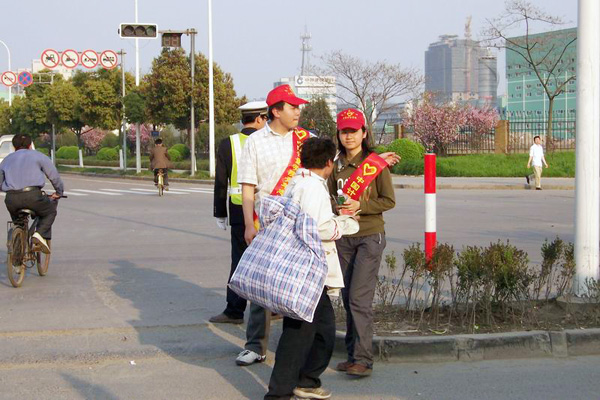 4月8日下午,下沙開發區2號大街公交中心站里彩旗飄揚、人頭攢動,開發區創建文明城市暨“車輪轉轉、文明傳傳”系列志愿者啟動儀式正在那里進行著。這次活動是由開發區文明辦、城管辦主辦,下沙交警大隊、開發區團工委、杭州下沙公交公司和我校團委共同承辦的。我校青年志愿者總隊和來自各個二級學院的共二百名志愿者參加了當天的啟動儀式。   啟動儀式上,校團委書記巢岺致辭。他說,把杭州建設成為全國文明城市是每一位杭州市民的愿望,是我們在杭高校以及高校大學生一件殷切盼望的事情,同時也是我們學在杭州的幾十萬大學生為杭州應盡的義務和責任。能夠參加這次由開發區團工委組織的志愿者活動,更是我校青年志愿者的光榮,作為開發區高教園區的高校,我們的青年學生理應為開發區的文明建設付出努力,我們也有信心做好這項工作。   隨后,校青年志愿者總隊隊長李江同學代表志愿者發言,表達了志愿者以身作責、保質保量完成任務的決心和信心,同時號召全區青年學生從身邊做起,從點滴做起,做文明市民,更做文明使者,為提高市民整體素質添磚加瓦,為開發區的文明建設添光加彩。   啟動儀式結束后,志愿者們頭戴小紅帽,分赴17個社區和20個交通路口、公交站點開展文明勸導等志愿服務。他們有的在人行橫道處勸導過往行人,囑其遵守交通規則;有的在公交車站組織乘客排隊上車,倡導乘客養成文明的乘車習慣;有的主動向市民群眾分發文明宣傳冊,進行全國文明城市創建宣傳。頭上的炎炎烈日擋不住志愿者們熱情的心,他們始終微笑著耐心宣傳、規勸。志愿者們主動真誠的服務,也引起了過往行人的注意,他們紛紛駐足,配合勸導和宣傳,認真聽取志愿者的細心講解,同時紛紛表示要融入開發區文明建設中,講文明話、辦文明事、做文明人。   據悉,早在3月中旬,校青年志愿者總隊就已經和開發區管委會聯系,為此次活動開展細致而全面的前期準備工作,志愿者在開發區全區范圍內進行了公交情況調查,發放并回收了近六千份問卷,配合公交公司對開發區乘車情況進行了摸底。其后,又開展了歷時一周的“文明乘車、文明行走”活動,配合交警對行人進行文明宣傳和規勸。