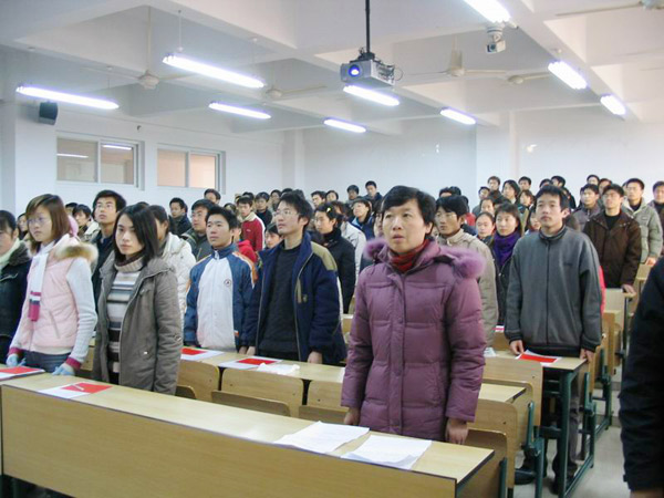 隨著教室里莊嚴的《國際歌》奏起,儀式正式開始。在學生黨員蘇沛然同學的領誓下,全體新黨員進行了宣誓,鏗鏘有力的誓詞,渾厚響亮的聲音,表達了共產黨人堅定的信念和必勝的決心。