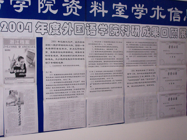 外國語學院成立至今已一年時間,回顧一年來全院教師團結努力、積極進取,在教學和科研中取得了可喜的成績。為了推動學院的科研活動,激勵教師確立更高的目標,該學院于12月23日舉辦了“2004年度外國語學院科研成果回顧展”。此次展覽全面展出了該學院校級精品課程、校級重點課程的建設情況及學院的科研成果。據悉,該學院的“學術信息服務窗”也將在“學術交流”欄目上分期、分批刊登學院教師的科研成果。