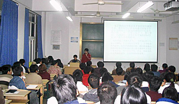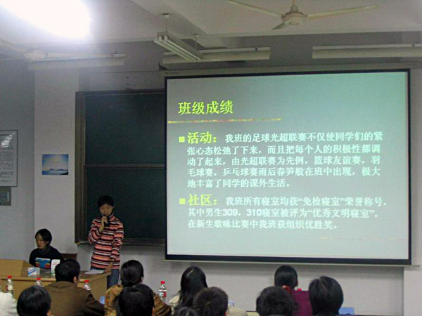 各參賽班級(jí)分別用演示幻燈片展現(xiàn)了班級(jí)在學(xué)習(xí)、文體、社會(huì)活動(dòng)、實(shí)踐活動(dòng)等方面的成績(jī)與收獲。各班講解員以或幽默、或誠懇、或激昂的語氣講述了本班在學(xué)風(fēng)建設(shè)上的特點(diǎn)以及取的成績(jī)。他們的精彩展示與講解博得了在場(chǎng)老師與同學(xué)的陣陣掌聲。孫彩霞為活動(dòng)進(jìn)行了點(diǎn)評(píng),并對(duì)各班級(jí)尤其04年級(jí)新生提出了殷切希望。