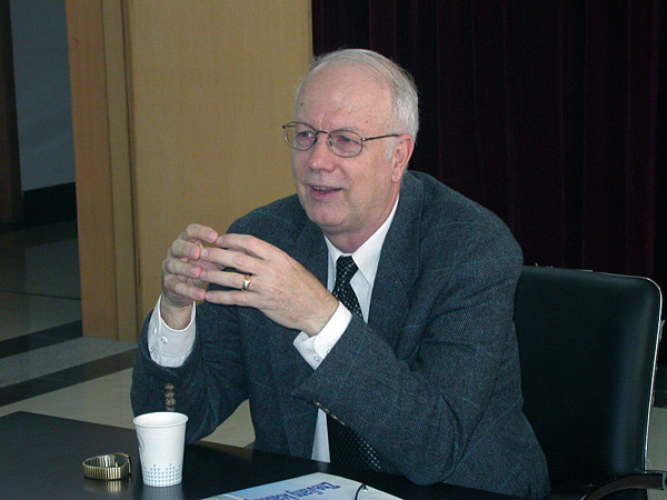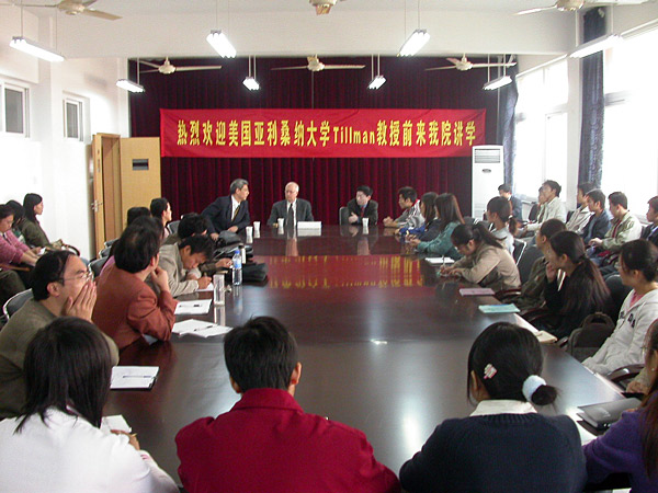 10月29日上午,美國亞利桑納州立大學歷史學系教授、哈佛大學博士、北京大學中國古代史研究中心訪問教授田浩先生在我校人文社科學院兼職教授、浙江省社會科學院哲學所所長滕復研究員的陪同下來我校做了題為《學術研究中的創新與進路》的專題講座。人文社科學院專業課教師、03級公共事業管理專業的學生到場聆聽了講座。   人文社科學院院長何俊教授首先代表學院對田浩教授一行的到來表示歡迎。田浩教授從具體實例入手,深入淺出的闡述了創新的重要意義,他尤其強調了青年人應具有創新精神,應不斷培養自己的創造力。在講座過程中,田浩教授還結合自身的研究,分析了美國學術研究與中國學術研究的異同,進而對學術研究中如何實現創新提出了自己的觀點。