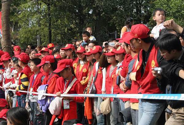 為了讓志愿者能更好地熟悉工作環境和工作任務,確保工作的萬無一失,考慮到學校離市區遠,因此當天清晨5點多,志愿者就已經穿上紅背心從校區出發了。6:10左右,第一隊志愿者在省人民大會堂下車,志愿者不顧清晨秋風的涼意立刻投入到工作中去,搬桌子、拿凳子、擺盆景、拉橫幅忙的不亦樂乎。還有一隊志愿者來到了原來的人民大會堂,把幾十名青少年報的小記者帶到指定地點觀看巡演,并負責保護他們的安全。8:30左右,開始有人陸續入場,志愿者們又開始了檢查入場券、維護秩序等新的工作。臨近9:30,游行即將開始,在南山路附近,志愿者身后的人也越來越多,越來越擠,志愿者們站成一排,手挽手,組成了一道人墻保護好小記者。隨著游行隊伍的陸續經過,小記者們不斷地按下快門,而志愿者們卻一直在用力抵住不斷前涌的人群。負責小記者的潘老師不禁感慨地對他們說:“你們更是應該拍拍你們身后的大哥哥,大姐姐,他們因為你們多辛苦啊!”此時在游行隊伍中出現了一個熟悉的“紅”身影,原來是第一隊中的幾位志愿者在為外國代表團舉牌。直至12點多游行結束,小記者安全撤退了,志愿者才算是松了一口氣,跨開步子時才發現雙腿已經麻木了,餓得已經沒有感覺了。