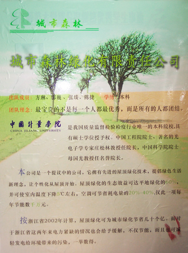 6月10日至11日,2004年浙江省“挑戰杯”大學生創業計劃競賽終審決賽在浙江師范大學舉行。我校計量技術工程學院方琳、郭巍、張琰、陳捷四位同學組成的創業團隊攜作品《城市森林綠化有限責任公司創業計劃》參加了決賽,并榮獲二等獎。