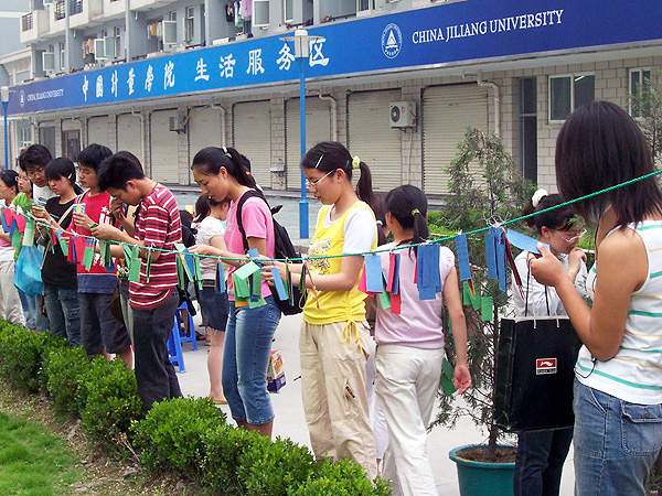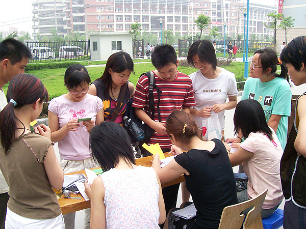 5月30日,外國(guó)語(yǔ)學(xué)院舉辦了英語(yǔ)節(jié)系列活動(dòng)之“綠色幻影”——英語(yǔ)猜謎活動(dòng)。此次活動(dòng)在生活區(qū)門(mén)口舉行,從中午11:30一直持續(xù)到下午4:00,形式新穎,內(nèi)容豐富、全面。期間,天空飄起的毛毛細(xì)雨也絲毫阻擋不了同學(xué)們猜謎的濃厚興趣。