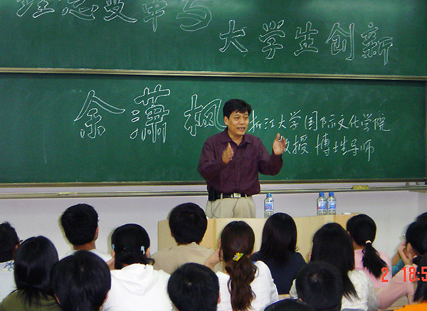 6月1日晚6:30,浙江大學國際文化學院教授、博士生導師余蕭楓老師應我校人文學院邀請,在翔宇樓106教室作了題為《理念變革與大學生創新》的學術報告。余教授以其廣博的學識,活躍的思維,風趣的言談博得了同學們的陣陣掌聲。本次旨在提高學生理念管理、創新意識的講座受到了學生的熱烈歡迎。