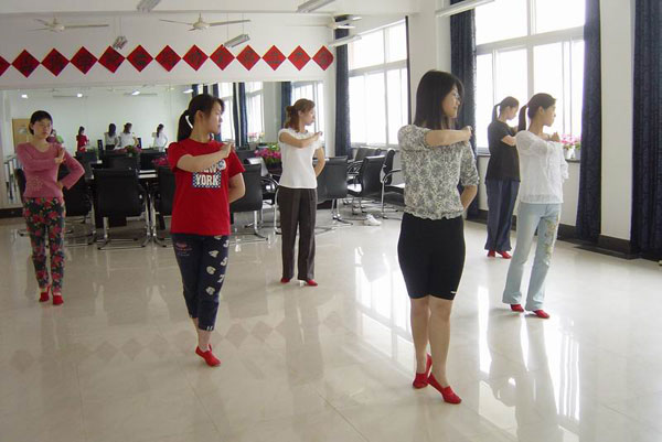外國語學院分工會舞蹈協會自5月10日成立以來,得到了學校各部門和各二級學院的大力支持。按照舞協制訂的工作計劃,協會于6月2日首次開辦了舞蹈形體培訓班,并確定今后的訓練日程和地點。   參加此次培訓班的外國語學院中青年教師共有40余人,在浙江省舞蹈家協會會員連紅老師的輔導下,她們合著優美的旋律,在把桿上練習芭蕾的基本手位、腳位;在地面組合中對著鏡子糾正自己的動作,親身體驗到舞蹈藝術給大家帶來的歡樂。訓練中,多功能室整體的布置和音樂舞蹈的揉和營造了一個強烈的藝術氛圍。