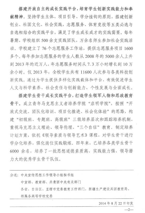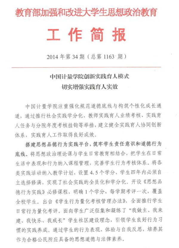 8月22日,教育部在《加強和改進大學生思想政治教育工作簡報》(2014年第34期)中,以《中國計量學院創(chuàng)新實踐育人模式 切實增強實踐育人實效》為題,專刊報道我校注重強化規(guī)范道德底線與構(gòu)筑個性化成長通道,多舉措建立健全實踐育人協(xié)同創(chuàng)新體系,實踐育人工作取得良好成效。