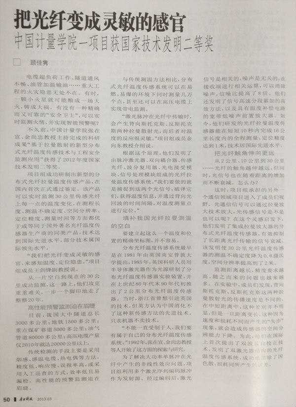 浙江省優秀科技期刊《今日科技》在2013年3月總第399期的“研發創新”欄目中,發表題為《把光纖變成靈敏的器官》一文,報道我校一研究項目獲得國家技術發明二等獎。