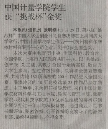 12月11日,《浙江教育報(bào)》發(fā)表《中國(guó)計(jì)量學(xué)院學(xué)生獲“挑戰(zhàn)杯”金獎(jiǎng)》一文,報(bào)道我校學(xué)生組成的賽科爾創(chuàng)業(yè)團(tuán)隊(duì)作品獲全國(guó)金獎(jiǎng)。
