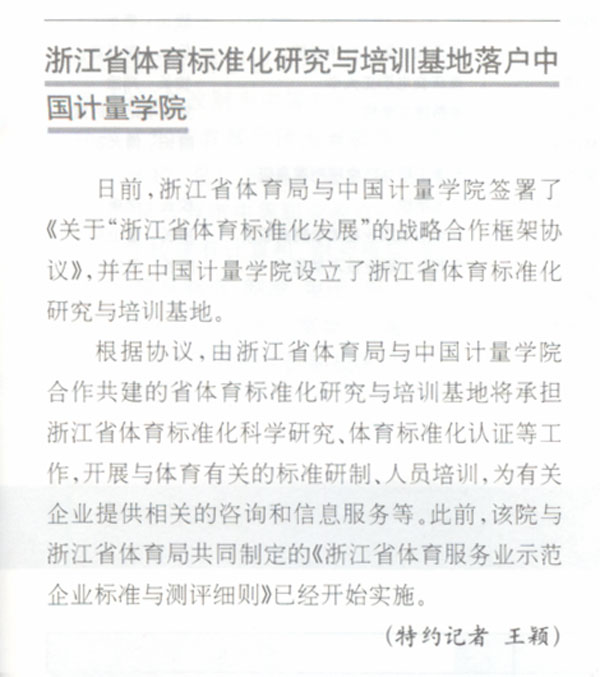 2010年4月,全國中文核心期刊《教育與職業》在“院校傳真”欄目發表相關文章,報道了浙江省體育標準化研究與培訓基地落戶我校的情況。
