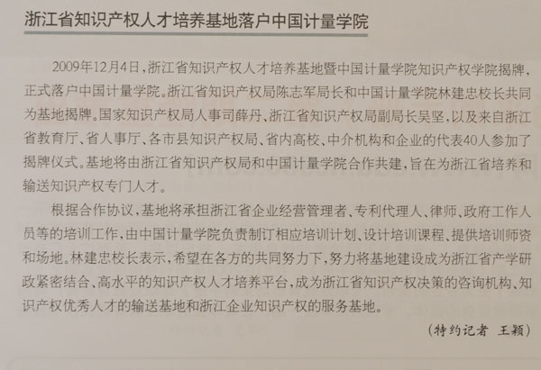 2010年2月,全國中文核心期刊《職業與教育》雜志在“院校傳真”欄目發表了題為《浙江省知識產權人才培養基地落戶中國計量學院》的文章,對我校與省知識產權局合作共建浙江省知識產權人才培養基地一事進行了報道。