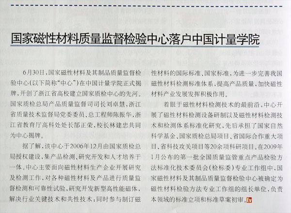 2009年10月,《教育與職業(yè)》在第28期發(fā)表題為《國(guó)家磁性材料質(zhì)量監(jiān)督檢驗(yàn)中心落戶中國(guó)計(jì)量學(xué)院》的文章,報(bào)道了國(guó)家磁性材料及其制品質(zhì)量監(jiān)督檢驗(yàn)中心在我校掛牌的情況,并介紹了中心的建設(shè)成果。