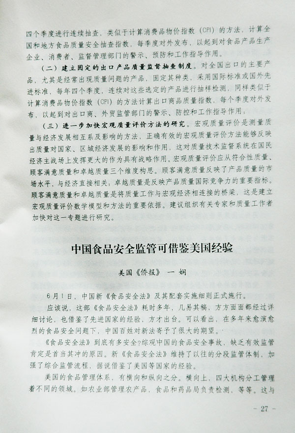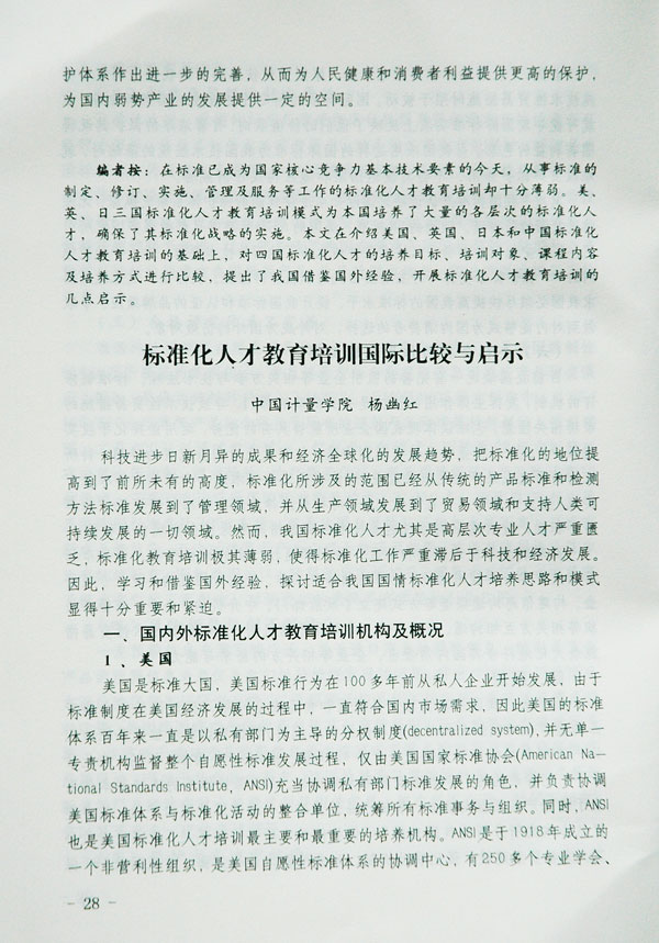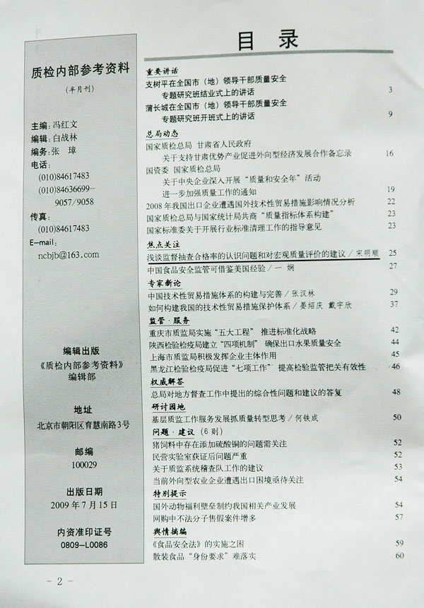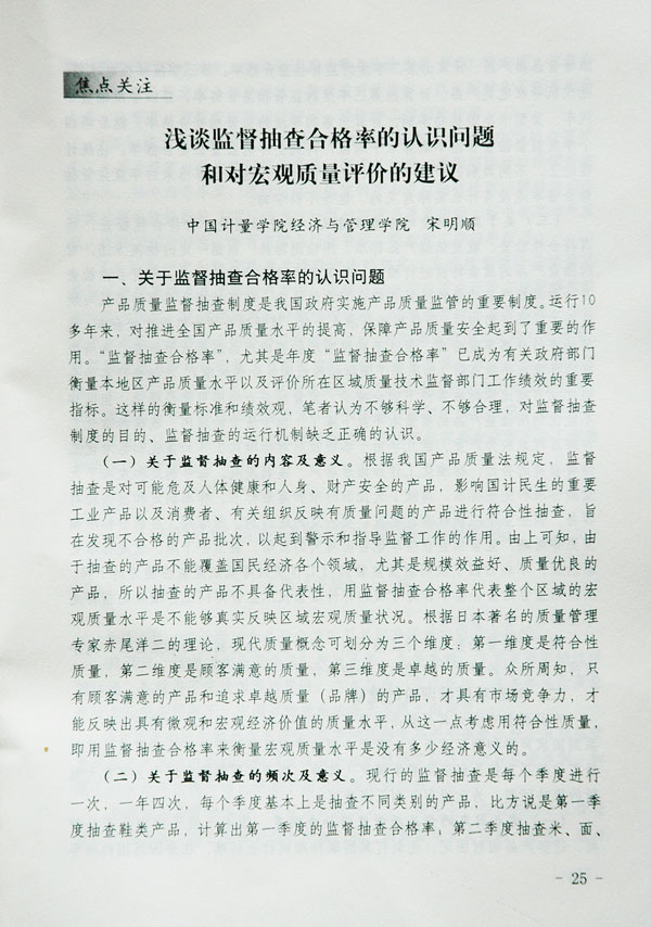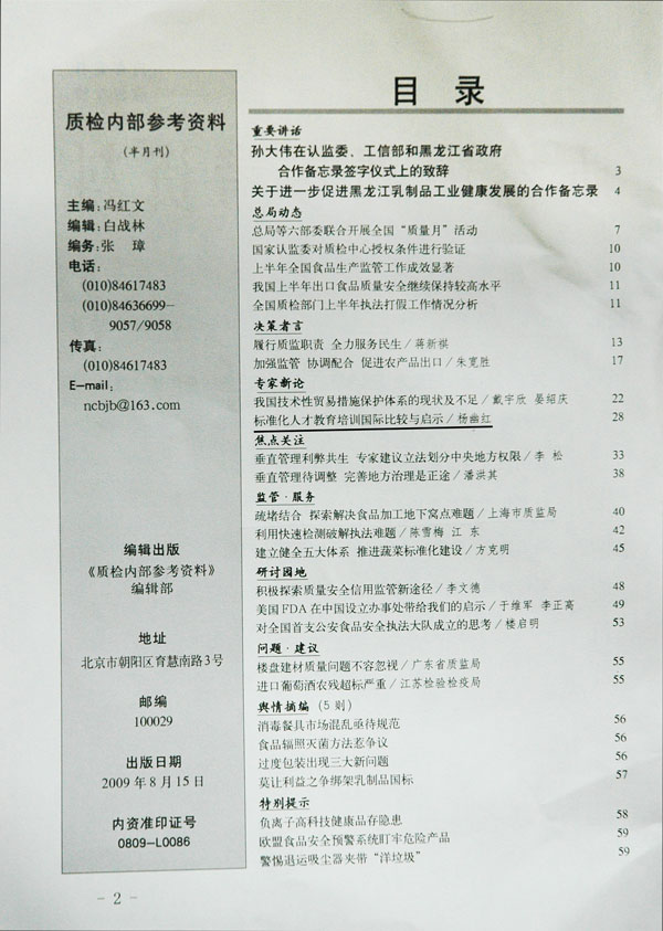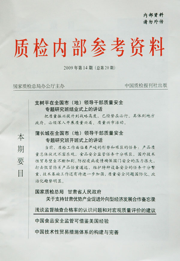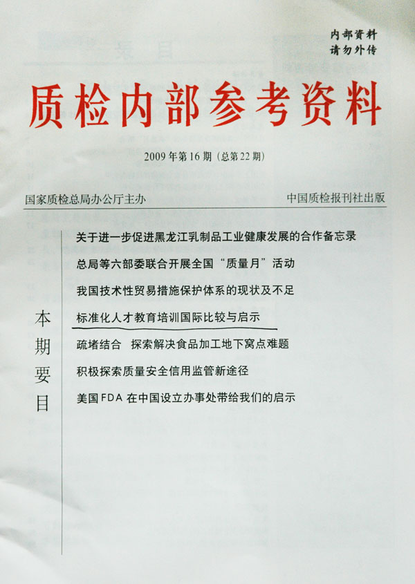 《質檢內部參考資料》是由國家質檢總局辦公廳主辦,中國質檢報刊社自去年起編輯出版的一份內部交流刊物。在接到《質檢內部參考資料》的約稿后,我校當即組織選送了一些教師的論文,并在近期得以發表。《質檢內部參考資料》在7月15日出版的第20期的“焦點關注”欄目中,刊發了宋明順老師的《淺談監督抽查合格率的認識問題和對宏觀質量評價的建議》一文;8月15日出版的第22期的“專家新論”欄目中,刊發了楊幽紅老師的“標準化人才教育培訓國際比較與啟示”一文。兩篇文章還同時被選入了當期的要目被重點推薦。
