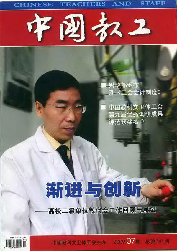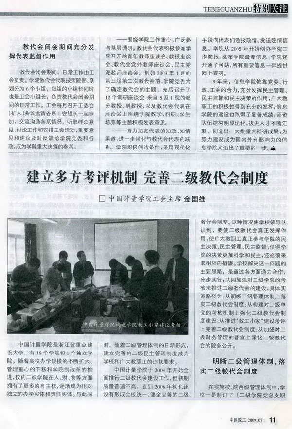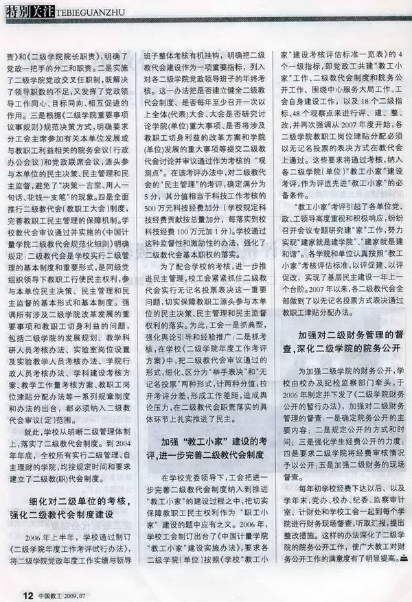 近日,《中國教工》在2009年第7期的“特別關注”欄目,以較大篇幅登載了我校《建立多方考評機制,完善二級教代會制度》一文。文章從明晰二級管理體制,落實二級教代會制度、細化對二級單位的考核,強化二級教代會制度建設、加強“教工小家”建設的考評,進一步完善二級教代會制度、加強對二級財務督查,深化二級學院的院務公開等幾個方面,重點介紹了我校二級教代會建設的經驗。這是繼2008年6月《高教領導參考》載文推薦我校二級教代會建設經驗后,高校二級教代會建設的經驗首次在中國科教文衛體工會主辦的《中國教工》雜志被重點推薦介紹。