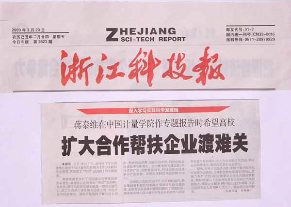 3月20日,《浙江科技報》在頭版頭條的重要位置,在“深入學習實踐科學發展觀”專欄中發表題為《蔣泰維在中國計量學院作專題報告時希望高校擴大合作幫扶企業渡難關》的文章,報道了蔣廳長來我校作學習實踐科學發展觀活動專題輔導報告的情況。