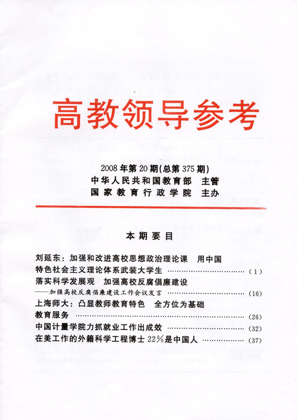 近日,《高教領導參考》在2008年第20期的學生工作欄目,以較大篇幅登載了《中國計量學院力抓就業工作出成效》一文。文章重點介紹了我校克服畢業生人數激增、供求矛盾突出等困難,在就業工作中所采取的:強化就業工作機制,大力推進就業工作;構建全員就業體系,全力促進畢業生就業;立足行業,面向社會,拓展就業市場;實施全程就業指導,著力提升就業競爭能力等舉措。