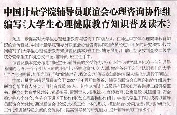 5月27日,《教育信息報》發表文章,報道了我校輔導員聯誼會心理咨詢協作組編寫《大學生心理健康教育知識普及讀本》的情況。