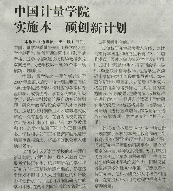 3月13日,《教育信息報》在頭版發表了題為《中國計量學院實施本—碩創新計劃》的文章,報道了我校啟動本—碩創新計劃,提高人才培養質量的情況。