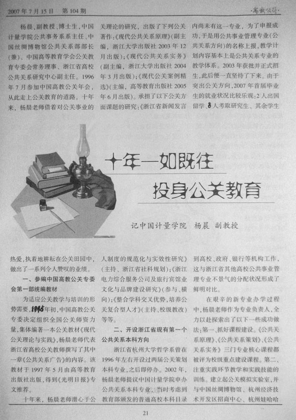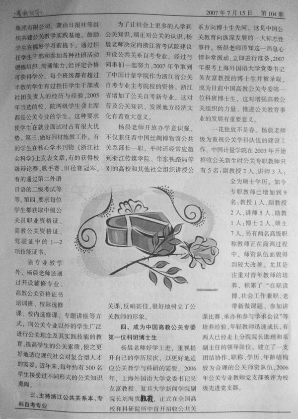 中國高等教育學會公共關系教育專業委員會主辦的《高教公關》雜志第104期(2007年7月刊印),在“優秀公關師生”欄目以“十年一如既往 投身公關教育”為題,對我校人文社科學院公共事務系楊晨老師作了專門介紹。