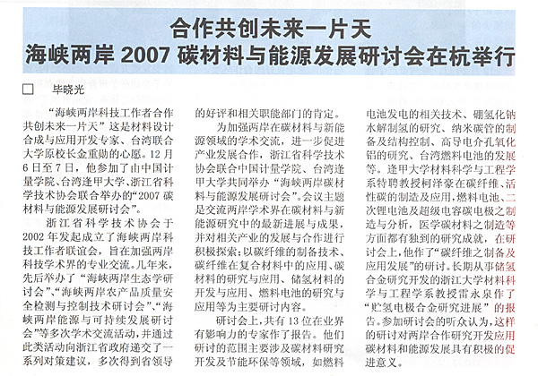 2007年12月,《今日科技》雜志發表了題為《合作共創未來一片天 海峽兩岸2007碳材料與能源發展研討會在杭舉行》一文,報道了由中國計量學院、臺灣逢甲大學、浙江省科學技術協會聯合舉辦的2007碳材料與能源發展研討會在我校召開的情況。