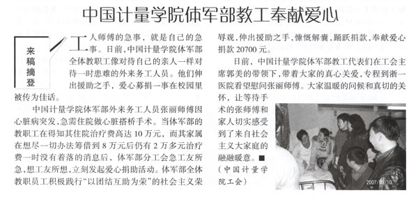 近日,《浙江教工》刊登題為“中國計量學院體軍部教工奉獻愛心”的文章,報道我校體軍部教工奉獻愛心的事跡。
