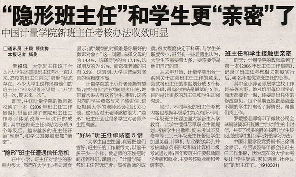 5月19日,《今日早報》發表了題為《“隱性班主任”和學生更“親密”了》一文,詳細介紹和報道了我校新班主任考核辦法收效明顯的相關情況。