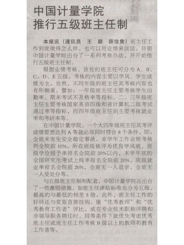 2007年6月7日,《教育信息報》發表了題為《中國計量學院推行五級班主任制》的文章,介紹了我校改革與創新班主任工作的情況。