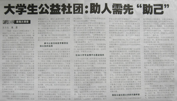 7月5日,《中國青年報》在《校園周刊》發(fā)表了題為《大學生公益社團:助人需先“助己”》的報道,介紹了我校以精品課程《大學生學習指導》為平臺,以培養(yǎng)學生的獨立人格、社會責任感和志愿者意識為切入點,為志愿者工作培養(yǎng)廣大的青年后備軍的相關(guān)情況。