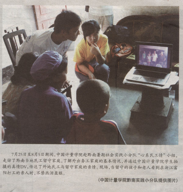 8月14日,《青年時(shí)報(bào)》刊登新聞圖片,圖文并茂地報(bào)道了我校赴黔南暑期社會(huì)實(shí)踐小分隊(duì)“心系民工情”小組開展活動(dòng)的生動(dòng)場(chǎng)景。