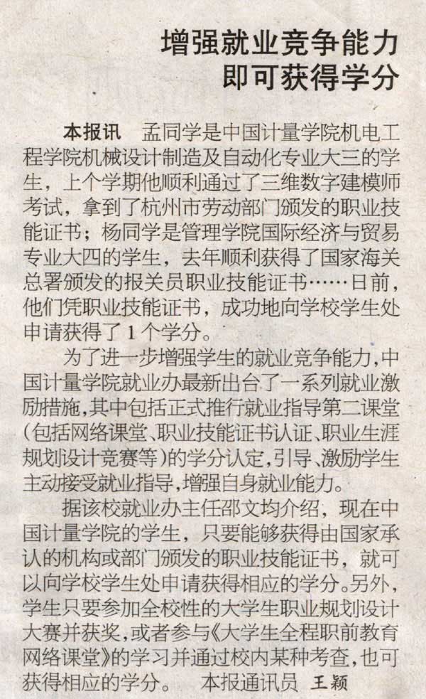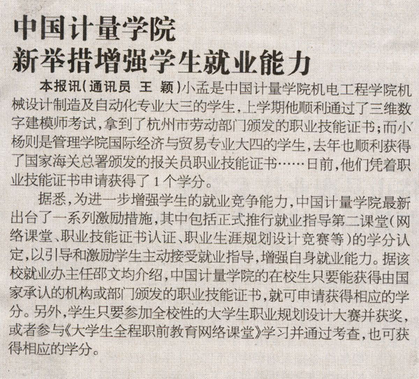《教育信息報》、《錢江晚報》分別刊登題為“中國計量學院新舉措增強學生就業能力”,“增強就業競爭能力即可獲得學分”的文章報道我校出臺新舉措增強學生就業能力的情況。