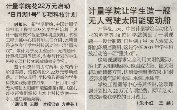 3月7日,《青年時報》、《都市快報》分別刊登題為“計量學院花22萬元啟動‘日月湖1號專項科技計劃’”、“計量學院讓學生造一艘無人駕駛太陽能驅動船”的文章報道我校啟動“日月湖1號”學生專項科技計劃情況。