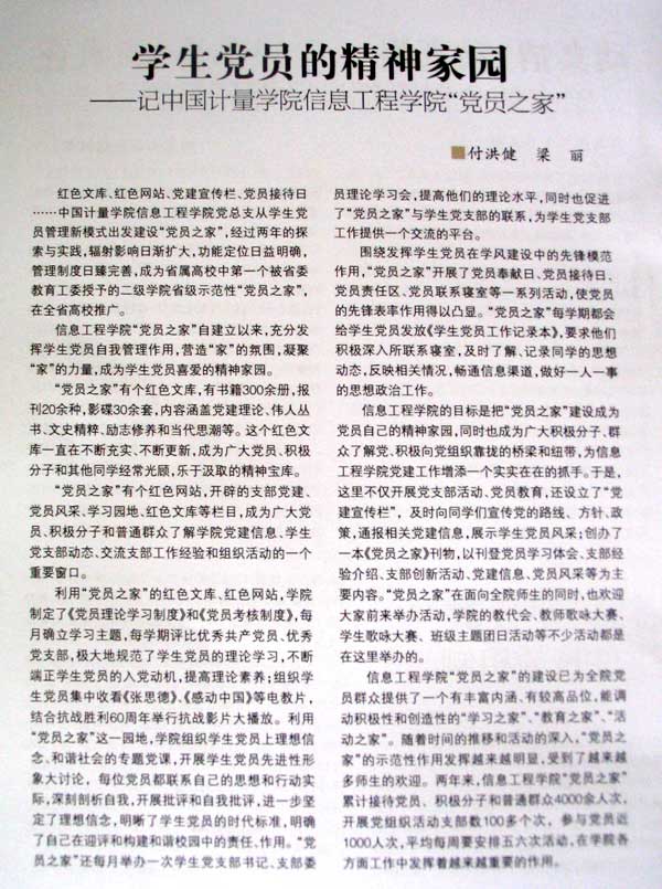 《共產(chǎn)黨員》雜志是中共浙江省委主辦,由浙江日報報業(yè)集團編輯、出版的浙江省黨建指導(dǎo)性刊物,一九九三年被評選為浙江省十佳期刊,一九九六年被評為浙江省一級期刊,一九九七年被評為華東地區(qū)優(yōu)秀期刊。2006年第6期的《共產(chǎn)黨員》在“黨建經(jīng)緯”欄目中,刊登了題為《學(xué)生黨員的精神家園--記中國計量學(xué)院信息工程學(xué)院“黨員之家”》的文章,詳細介紹我校信息工程學(xué)院“黨員之家”建設(shè)情況。全文如下: