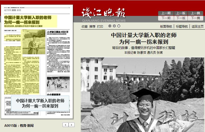 上周,中國計量大學辦理入職報到的辦公室,來了一位拄著拐杖、走路一瘸一拐的人。