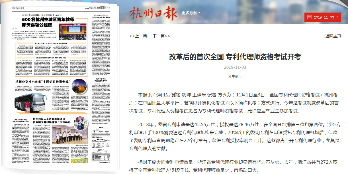 11月2日至3日,全國專利代理師資格考試(杭州考點)在中國計量大學舉行,繼續以計算機化考試(以下簡稱機考)方式進行。今年是考試制度改革后的首次考試,專利代理人資格考試更名為專利代理師資格考試,允許應屆畢業生參加考試。