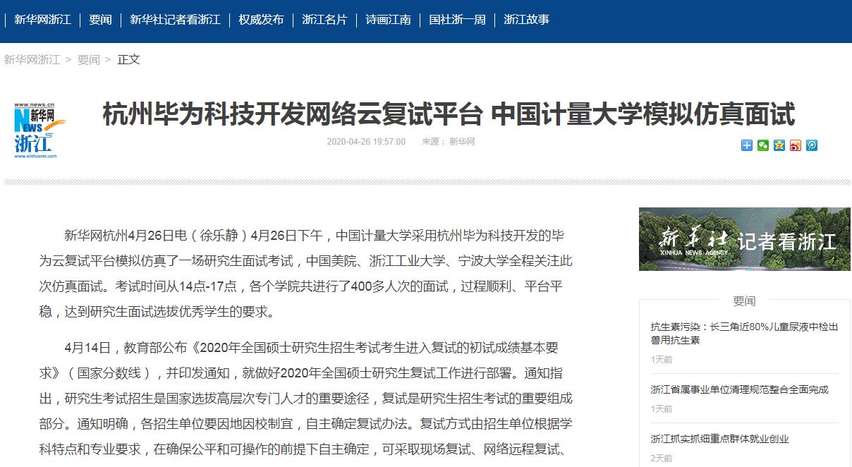 至此,網絡云復試正式進入國內高等教育研究生面試環節。中國計量大學在嚴格考察畢為云復試平臺各個應用環節后,認為畢為云復試平臺符合教育部研究生復試的各項指標要求,做到了四比對,三隨機,考試過程中現場感優秀,完全能夠為疫情期間高校研究生復試提供服務。