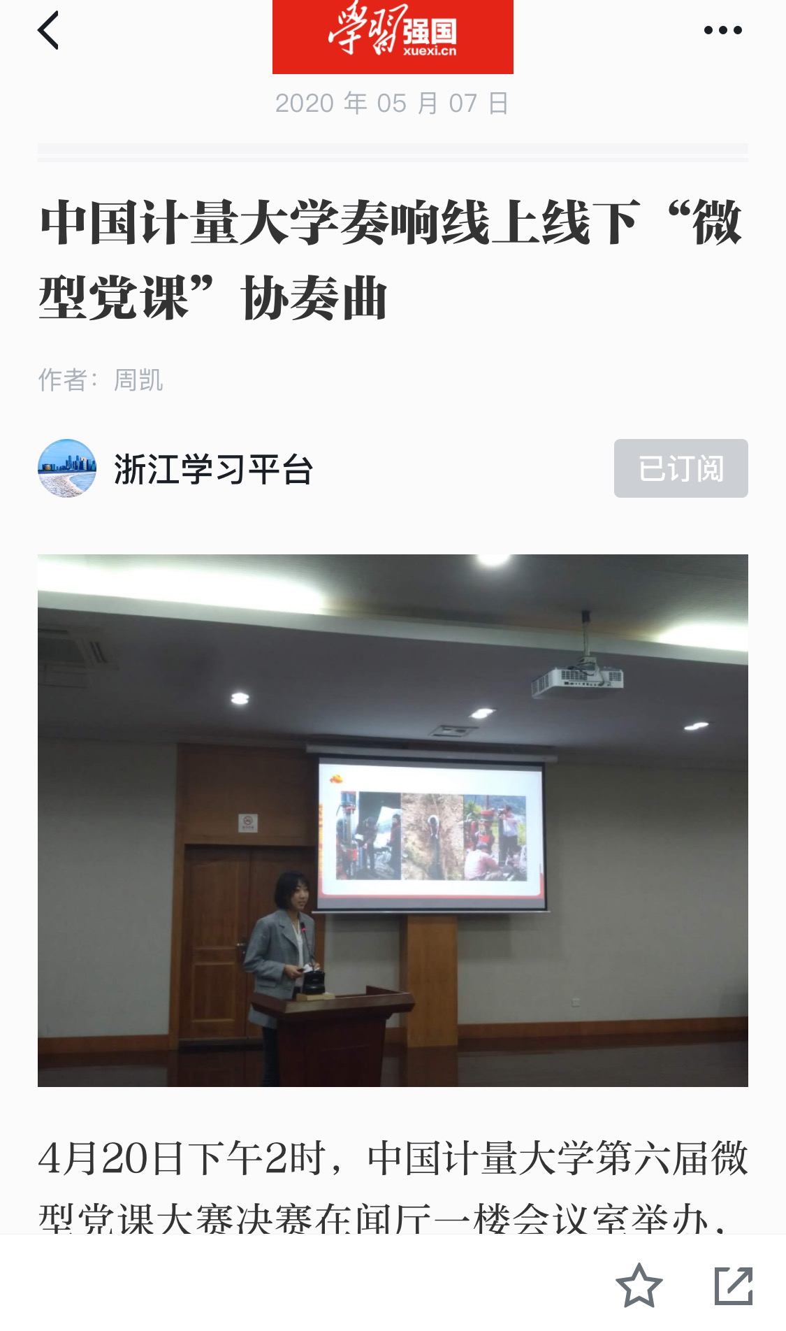 4月20日下午2時,中國計量大學第六屆微型黨課大賽決賽在聞廳一樓會議室舉辦,現場采取線上線下相結合的方式,選手們深情講述“決勝小康,奮斗有我;共享小康,幸福有我”的感人故事。大賽啟動以來,各黨委(黨總支)高度重視、廣泛動員,共有33名師生黨員報名參賽。經過初賽、復賽,共有12名師生黨員獲得決賽入場券。