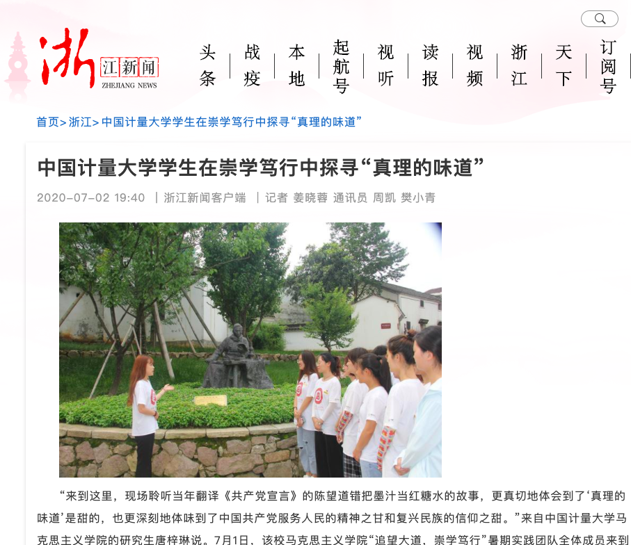 “來到這里,現場聆聽當年翻譯《共產黨宣言》的陳望道錯把墨汁當紅糖水的故事,更真切地體會到了‘真理的味道’是甜的,也更深刻地體味到了中國共產黨服務人民的精神之甘和復興民族的信仰之甜。”來自中國計量大學馬克思主義學院的研究生唐梓琳說。7月1日,該校馬克思主義學院“追望大道,崇學篤行”暑期實踐團隊全體成員來到義烏市陳望道故居,現場研讀《共產黨宣言》,認真學習習近平總書記給復旦大學青年師生黨員的回信精神,真真切切探尋真理味道。