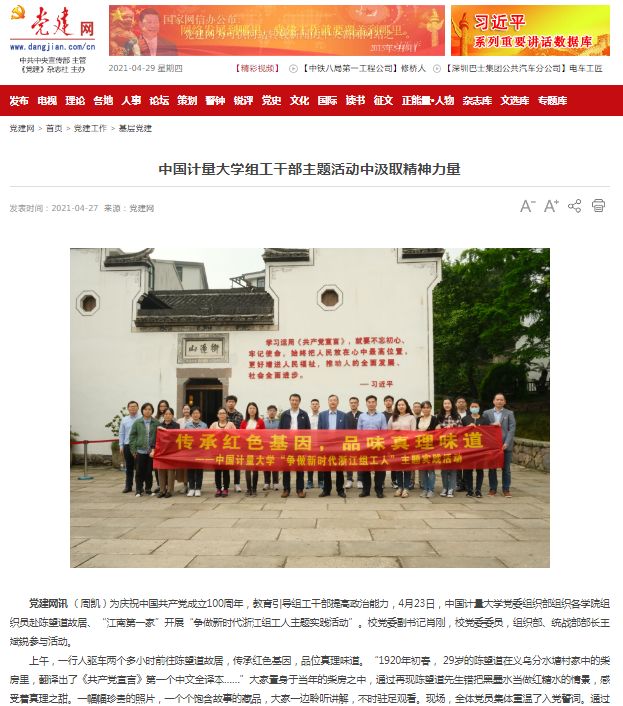 黨建網訊 (周凱)為慶祝中國共產黨成立100周年,教育引導組工干部提高政治能力,4月23日,中國計量大學黨委組織部組織各學院組織員赴陳望道故居、“江南第一家”開展“爭做新時代浙江組工人主題實踐活動”。校黨委副書記肖剛,校黨委委員,組織部、統戰部部長王斌銳參與活動。