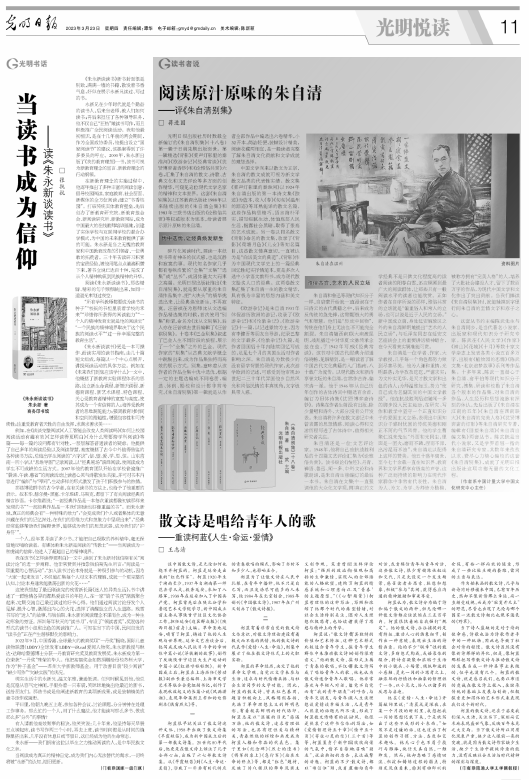 我校人文與外語學院教師、中國文化研究中心主任蔣進國撰寫的理論文章《閱讀原汁原味的朱自清》在3月23日出版的《光明日報》第11版“光明悅讀”專欄頭條發表。