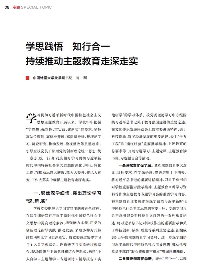 近日,浙江省委教育工委主辦的《高校思想政治工作》刊發學校黨委副書記肖剛署名文章《學思踐悟 知行合一 持續推動主題教育走深走實》,宣傳學校推動學習貫徹習近平新時代中國特色社會主義思想主題教育走深走實的扎實舉措和創新經驗。全文如下: