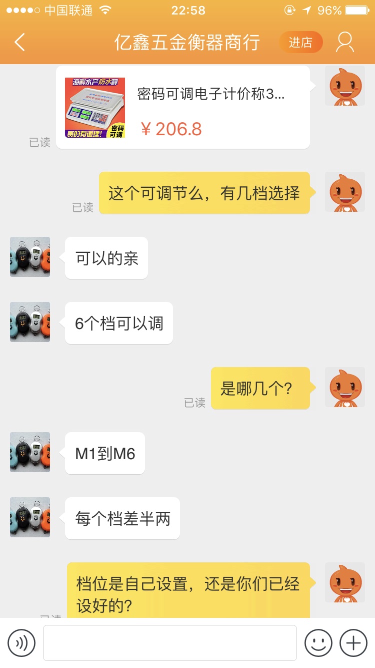 澎湃新聞以消費者身份咨詢了一家名為“億鑫五金衡器商行”的店鋪客服,該店鋪銷售多款商用電子秤均標注了“密碼可調”。其中,在一款售價206元的“海鮮水產防水秤”產品信息中,商家寫明“多功能電子稱使用方便…一天可以多掙幾百元,開機歸零輸入密碼直接就調”。