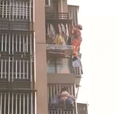 女孩雙手緊緊抓著保籠,也不敢說話。“別怕,我們是來救你的。”劉銀輝靠過去將女孩抱住,完成了與小伙子的“空中接力”,然后抱著女孩慢慢挪到右側的窗口,將孩子交給樓內的救援人員。前后10分鐘左右,女孩成功獲救。