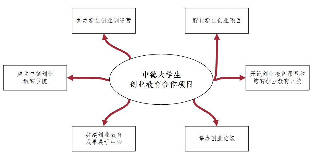 為更好的推進(jìn)學(xué)校創(chuàng)新創(chuàng)業(yè)教育工作,拓寬學(xué)生在創(chuàng)新創(chuàng)業(yè)領(lǐng)域的國際化視野,2015年5月,學(xué)校與德意志聯(lián)邦共和國中國服務(wù)中心協(xié)會(huì)簽署了合作開展中德大學(xué)生創(chuàng)業(yè)教育項(xiàng)目的協(xié)議,雙方在六個(gè)方面開展大學(xué)生創(chuàng)新創(chuàng)業(yè)教育全方位合作(見圖1)。