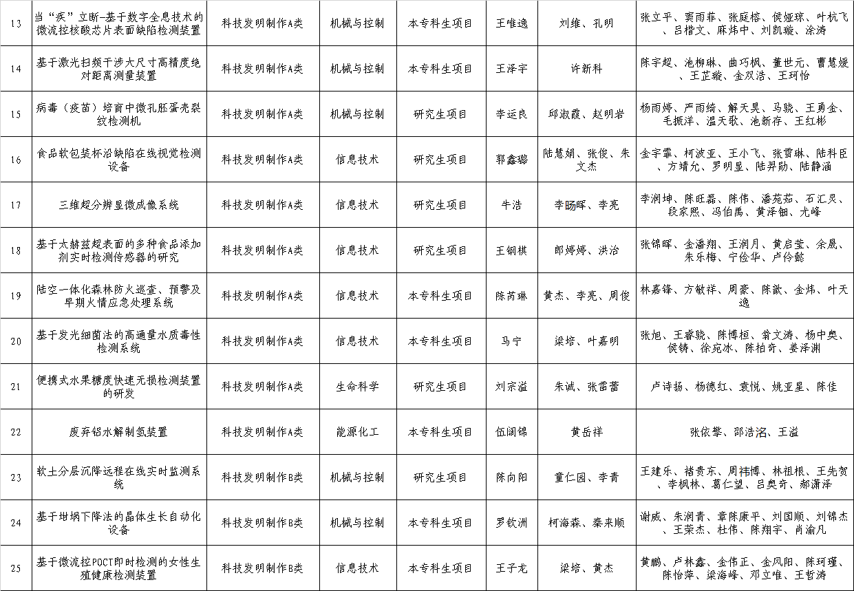經學校第十屆“挑戰杯”大學生課外學術科技作品競賽遴選,共推薦25件作品參加浙江省第十七屆“挑戰杯”大學生課外學術科技作品競賽,作品主要信息如下表所示,作品詳細信息見附件。
