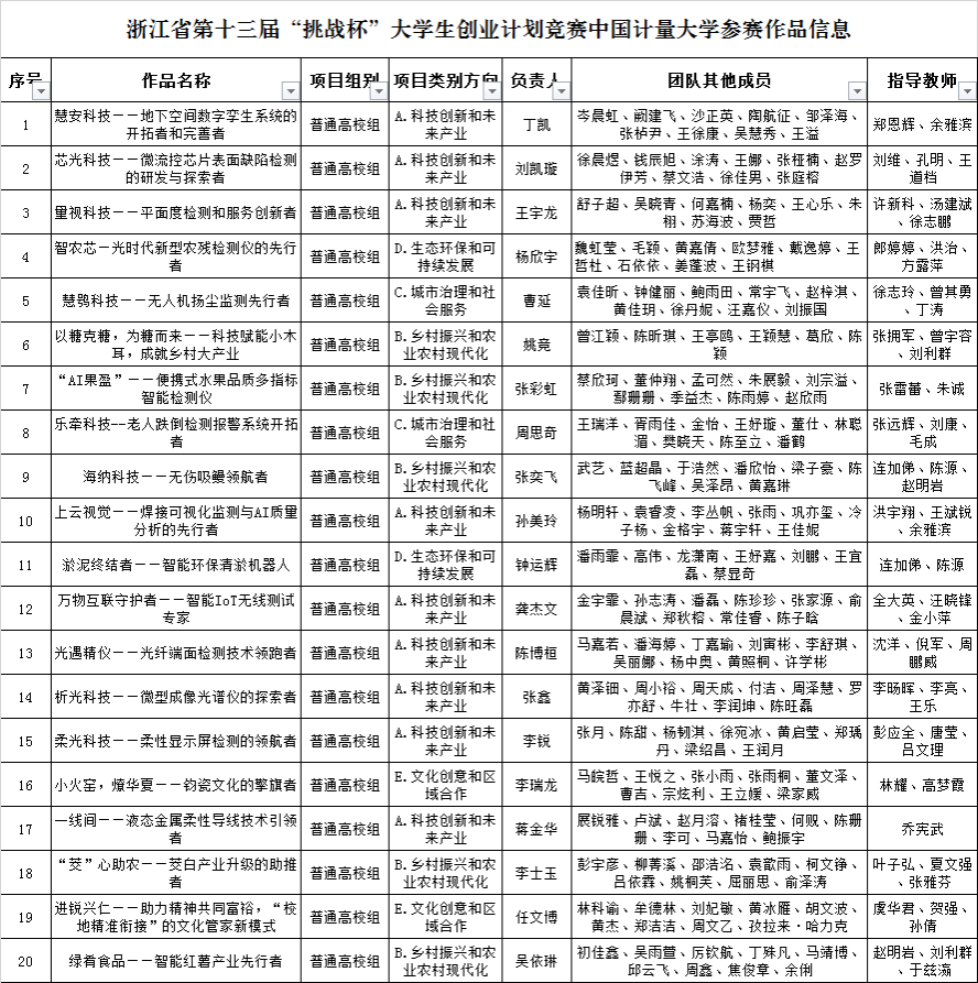 附件: 浙江省第十三屆“挑戰杯”大學生創業計劃競賽中國計量大學參賽作品信息.xlsx