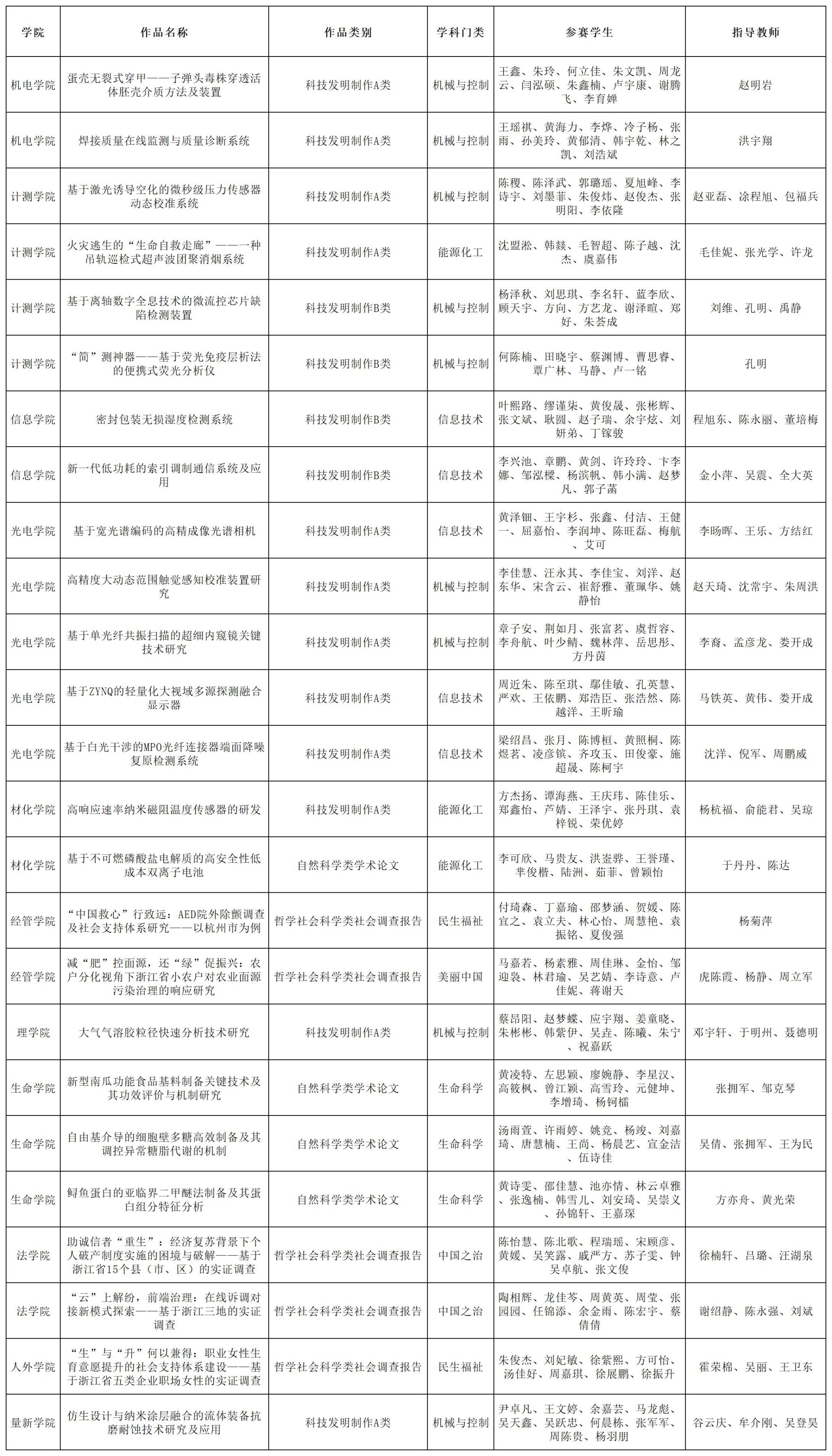 根據浙江省大學生創新創業大賽組委會發布的《關于組織開展浙江省第十八屆“挑戰杯”大學生課外學術科技作品競賽的預通知》要求,學校對參加浙江省第十八屆“挑戰杯”大學生課外學術科技作品競賽的25件作品進行公示,作品主要信息如下表所示。