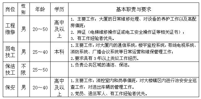 計量大廈位于西湖區文三西路,緊鄰華星廣場、東方通信,公交車出行方便。根據大樓物業日常運行工作的需要,我公司招聘工作人員若干名,具體要求如下: